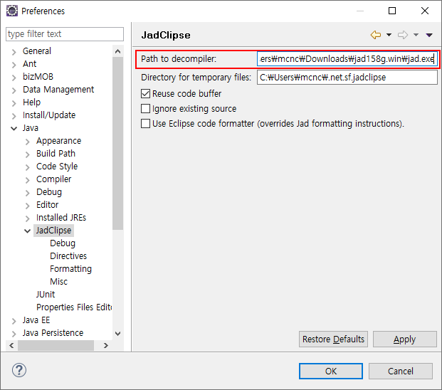 5. Window-Preferences-Java-JadClipse에 1에서 압축 푼 jad.exe 경로 입력