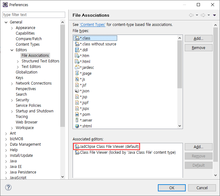 *.class의 Associated editors 가 JadClipse Class File Viewer (default)로 되어있는지 확인
