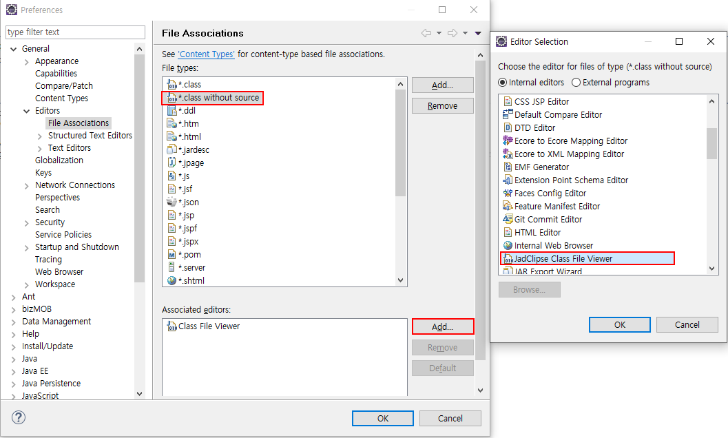 7. *.class without source에도 Associated editeros를 JadClipse~ 로 지정하고 OK