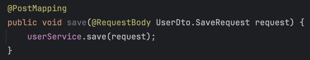 UserController는 클라이언트의 요청을 받아 UserService에서 요청에 해당하는 기능을 호출합니다.