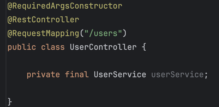 @RequiredArgsConstructor를 통해 final로 선언된 UserService를 자동으로 주입받습니다.