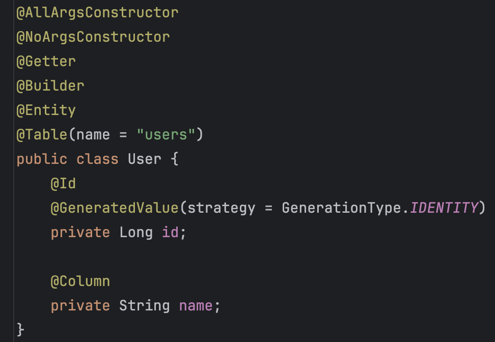 @Builder : 엔티티를 빌더패턴으로 편리하게 생성할 수 있도록 하기 위함