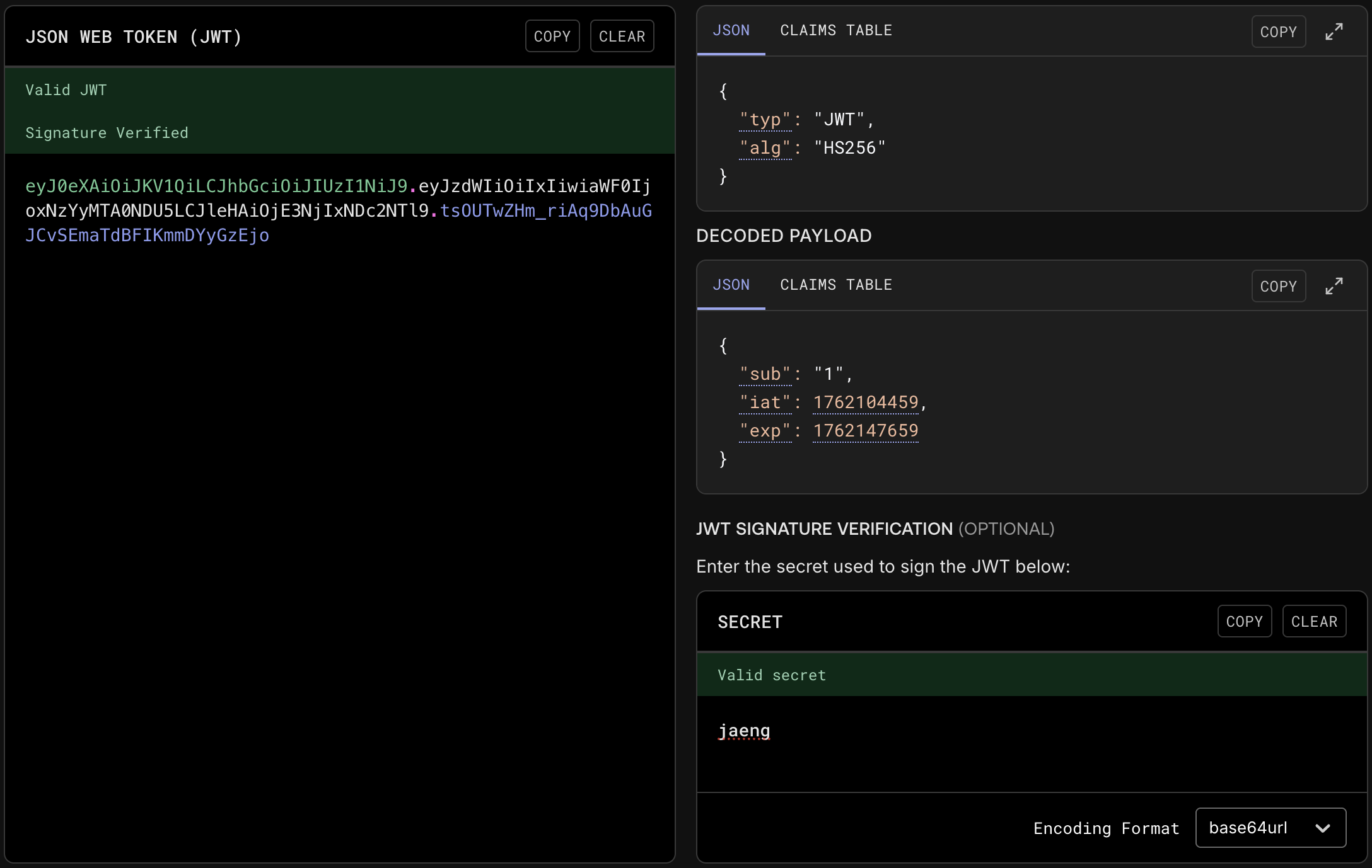 2. Payload : claims로 세팅한 데이터, 발급시각, 만료시각 => { "sub": "1", "iat": "..", "exp": ".." }, 인가에서 필요한 정보를 추가할 수 있습니다.