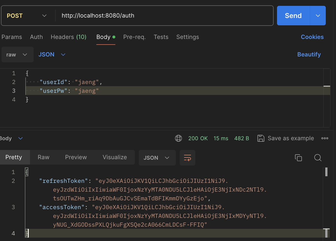 회원 정보를 올바르게 입력하면 이렇게 토큰 정보를 응답받습니다.