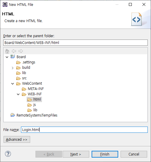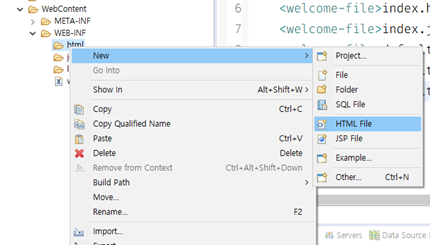 1. WebContent - WEB-INF - html 우클릭 - New - HTML File 선택